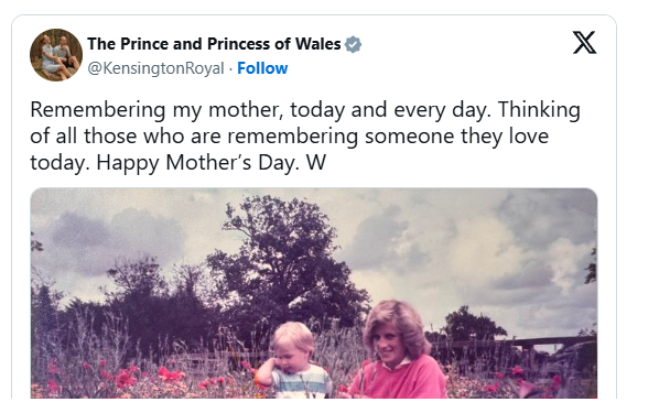 Prince William just shared a photo the world has never seen before — a tiny two-year-old boy in red trousers, surrounded by flowers, beside the mother he would lose before he turned 16. But behind this one quiet image lies a grief that has lasted nearly three decades, a scandal that rocked the Royal Family last year, and a Princess of Wales who was nowhere to be seen. There is a field in Gloucestershire where flowers once bloomed around a small boy in red trousers. He was two years old. He had no way of knowing that one day, more than forty years later, he would pull that photograph from a private collection and share it with the world — not as a king in waiting, but simply as a son who still misses his mother. That boy was Prince William. And the woman sitting cross-legged beside him in the grass, smiling at the camera in a bright pink jumper and jeans, was Diana, Princess of Wales. On Sunday morning, Kensington Palace posted the image quietly to its official social media pages, as Britain observed Mothering Sunday. No grand announcement. No elaborate caption. Just a photograph and a few words, handwritten in spirit if not in ink: “Remembering my mother, today and every day. Thinking of all those who are remembering someone they love today. Happy Mother’s Day. W” Just the letter W. Not a title. Not a formal name. Just a son, signing off. The photograph was taken in 1984 at Highgrove House, the Royal Family’s private estate in Gloucestershire — the same estate where Diana would host birthday parties, where she would sneak the boys sweets before dinner, where the illusion of a happy royal marriage was, for a time, beautifully maintained. Highgrove was where Diana tried to give her children the most ordinary life she could within the extraordinary walls of royalty. In the image, William — barely more than a toddler — is gazing down at the bright blooms surrounding him, seemingly transfixed by the petals. His white striped top and vivid red trousers give him the look of a boy dressed for a Sunday adventure, not a royal portrait. Diana sits beside him, not above him, not posed stiffly for the cameras. She is beside him. In the grass. Cross-legged. Smiling. It is the smile that stops you. It is not the performed smile of a woman under observation, though Diana spent years perfecting that version too. This is something looser, more private — the smile of a woman who is, in this moment, simply a mother watching her child discover flowers. Diana Frances Spencer was born on July 1, 1961. Had she lived, she would have turned 65 this coming summer. Instead, she died on August 31, 1997, in a tunnel in Paris, the result of a car crash that still, to many, feels impossible to fully comprehend. She was 36 years old. William was 15. His younger brother Harry was 12. For William especially, the loss has defined the shape of his adult life in ways both visible and invisible. He was old enough to understand what had happened, old enough to grieve consciously, but young enough that the grief would continue growing as he did — expanding to fill new spaces as the years passed. He grieved her at his wedding. He grieved her at the birth of each of his children. He grieves her, as he says himself, today and every day. He has spoken publicly about Diana more in recent years — carefully, selectively, always on his own terms. He established the Diana Award to honor her humanitarian legacy. He has contributed to documentaries. He has described the raw, formless grief of losing a parent as a teenager, the way it lands differently at every new milestone, because she is not there to witness it. But it is in the small gestures — a photograph shared on a Sunday morning, a single initial at the bottom of a message — that his grief feels most honest. Mother’s Day in Britain has, in recent years, become something of a complicated occasion for the Royal Family. For most of William and Catherine’s marriage, the day was marked with warm personal photographs — the Princess of Wales laughing with her three children, Prince George, Princess Charlotte, and Prince Louis, usually outdoors, usually in what appeared to be genuinely candid moments. The public loved them. They were soft, accessible, human. They were the version of royalty the couple had always tried to project: a real family, not just an institution. But last year, the tradition fractured publicly in a way no one had anticipated. A photograph released to mark Mother’s Day 2025 was pulled by major picture agencies — Getty, Reuters, the Associated Press — after editors noticed anomalies suggesting the image had been digitally altered. It is extraordinarily rare for agencies to pull a royal photograph. When they do, it signals something has gone wrong. The image showed Catherine with her three children, smiling in the kind of tableau that had become comfortingly familiar to the public. But on closer inspection, details appeared off. Hands did not quite sit right. Edges blurred in ways they should not have. The agencies flagged it. The internet — as it does — did the rest. The following day, Catherine issued an apology. She admitted she had edited the photograph. She described herself as an “amateur photographer” who “sometimes” experimented with editing. She expressed regret for any confusion caused. The explanation was accepted by some and quietly questioned by others. It arrived at a particularly sensitive time: Catherine had only recently gone public with her cancer diagnosis, and the months prior had been filled with public speculation about her absence from royal duties. Many had assumed the photograph was intended as a reassuring image — a signal that things were well, that the family was intact, that the Princess was present. The revelation that the photograph had been altered fed an already uneasy narrative. Royal watchers noted that the decision to release a manipulated image — however innocently done — had