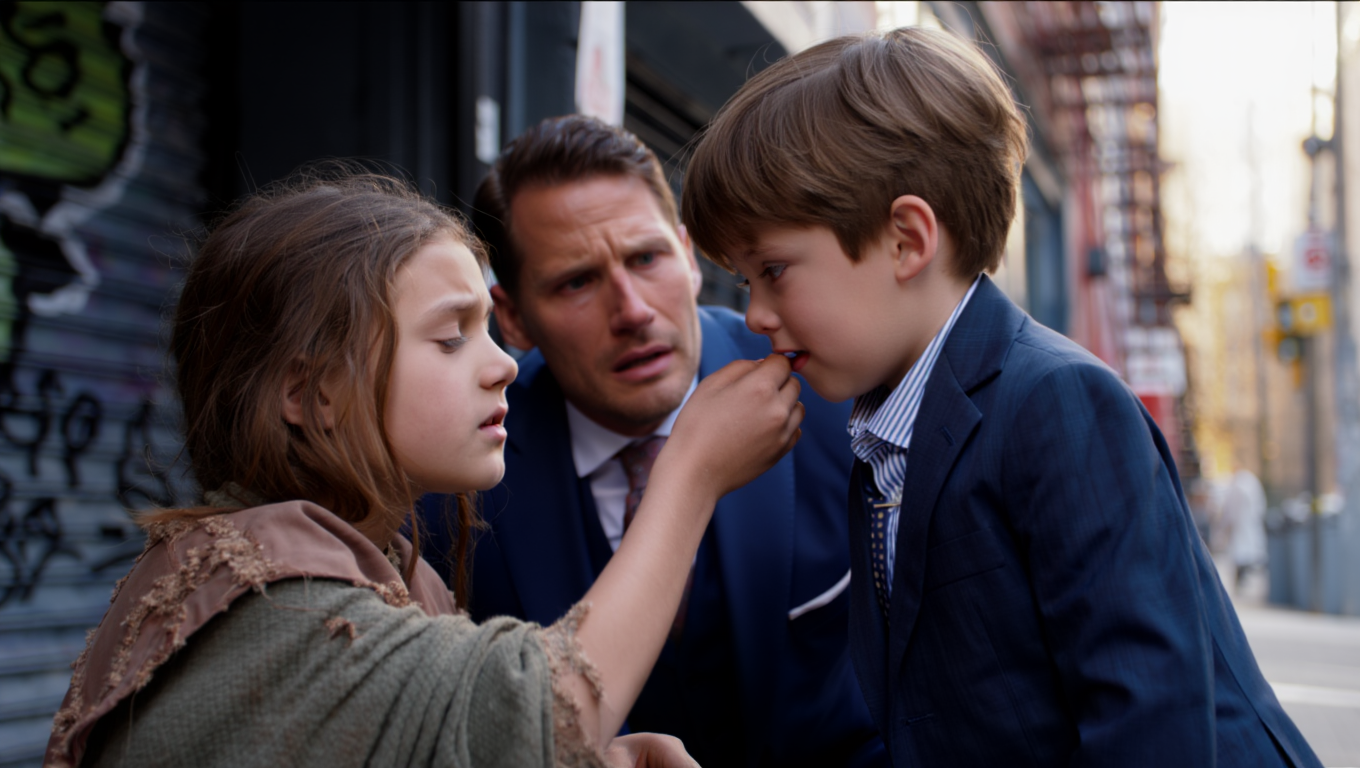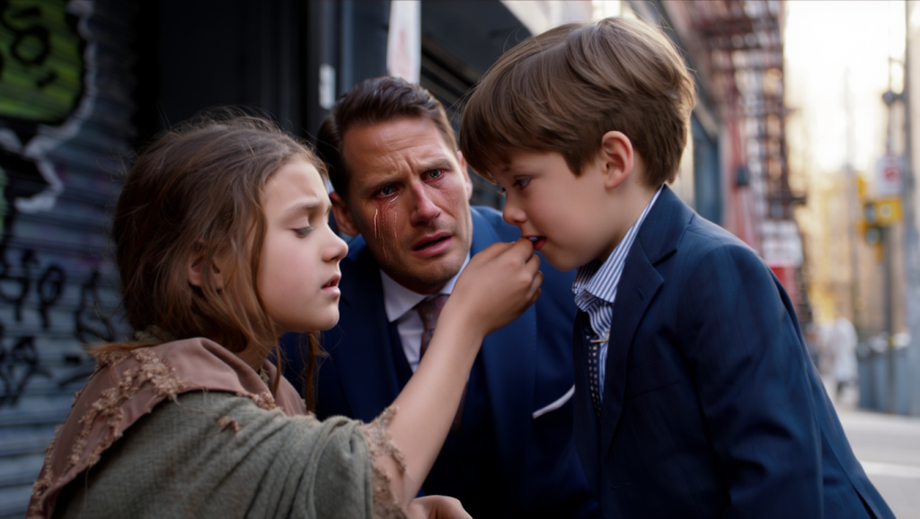 A homeless girl was helping a crying rich boy when his father stormed out screaming, “What did you do to my son?”… But what she was really doing left him speechless.