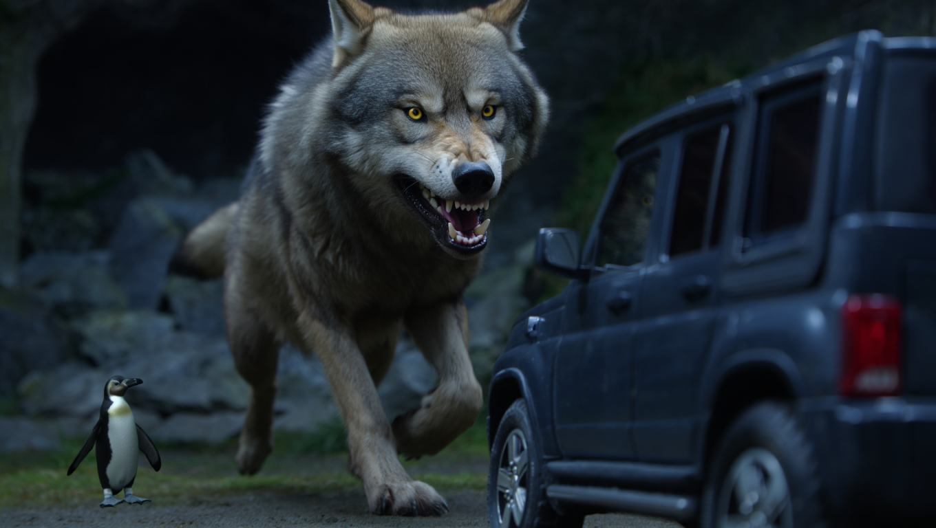 The wolf’s yellow eyes locked onto the empty space where the penguin had been. His head swiveled, tracking the fleeing bird, then slowly—terrifyingly slowly—turned to stare directly at me through my vehicle’s window.